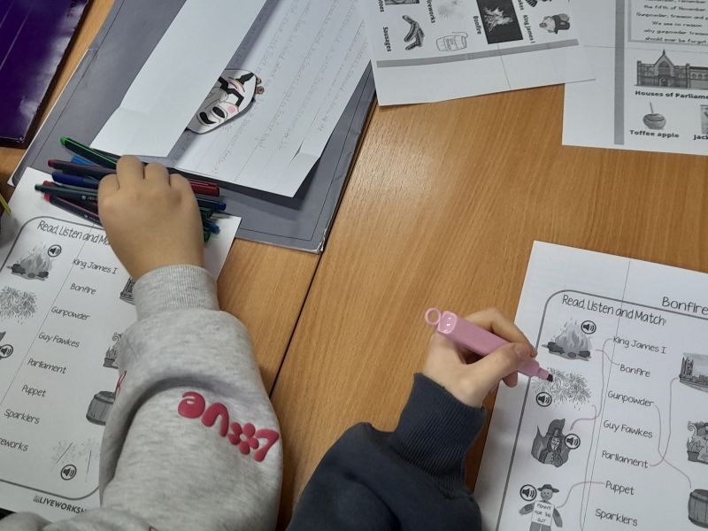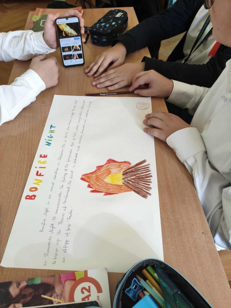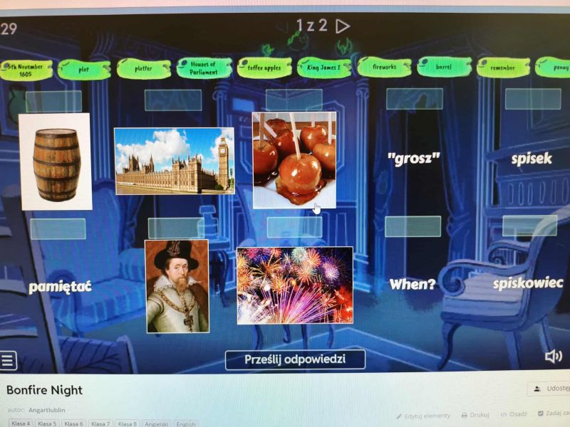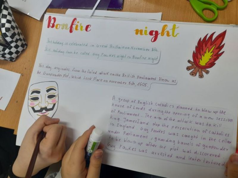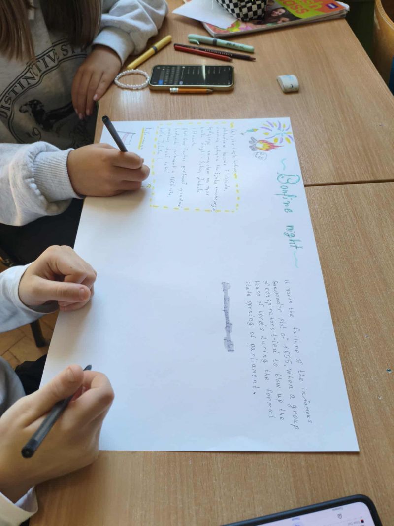 Podczas zajęć języka angielskiego uczniowie poznali historię spisku prochowego z 1605 roku oraz współczesne tradycje związane z tym dniem – ogniska, pokazy fajerwerków i parady. W ramach lekcji obejrzeli prezentację o obchodach tego święta, czytali rymowankę „Remember, remember the 5th of November”, oglądali krótki film edukacyjny oraz sprawdzili swoją wiedzę w quizie Kahoot i zadaniach z czytania ze zrozumieniem.