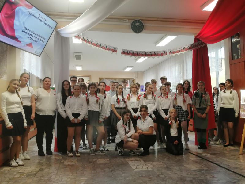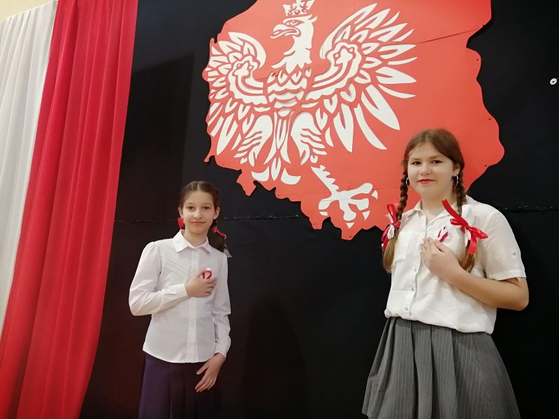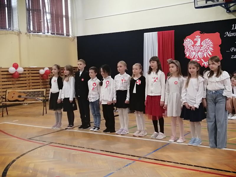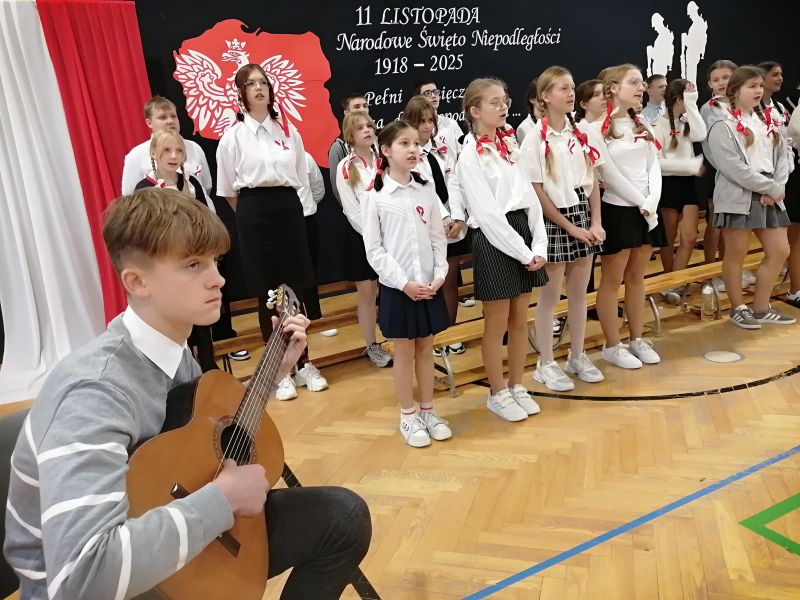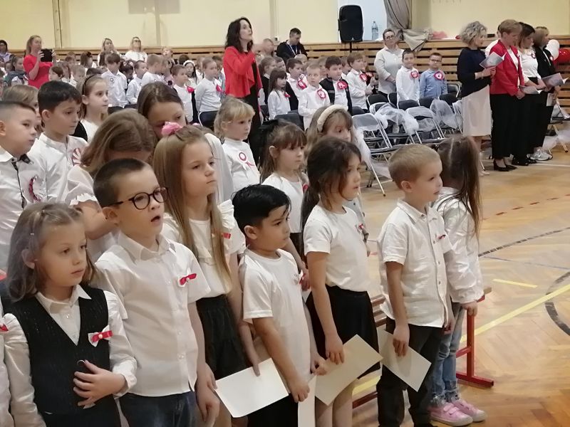 Cała społeczność szkolna, odświętnie ubrana w barwy narodowe, rozpoczęła uroczystość odśpiewaniem „Mazurka Dąbrowskiego” oraz „Roty” – na stojąco, z wielką powagą i dumą. Wspólne śpiewanie tych pieśni stworzyło podniosłą atmosferę, w której czuć było jedność i głębokie wzruszenie.