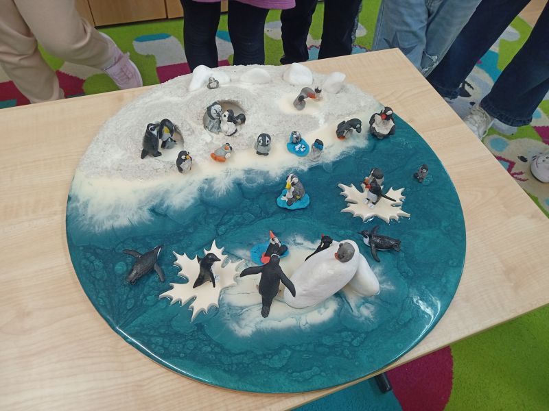 Na deser czekało na nas coś wyjątkowego – makieta z pingwinami. Były wśród nich zarówno gotowe figurki, jak i pingwiny wykonane samodzielnie przez uczniów. Kreatywność, zaangażowanie i współpraca sprawiły, że powstała prawdziwa, lodowa kraina!